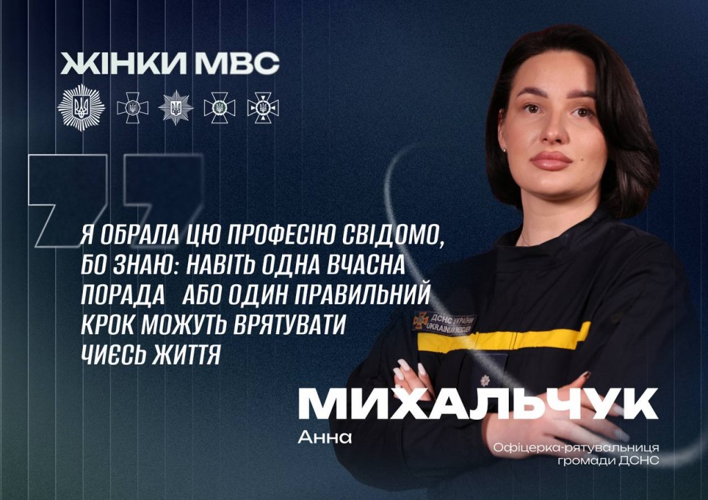 Ñïåöïðîºêò «Æ³íêè ÌÂÑ» - ïðî ³ñòî𳿠æ³íîê, ÿê³ îáðàëè ñëóæáó äåðæàâ³, äîëàþòü ïðîôåñ³éí³ âèêëèêè òà çì³íþþòü ñèñòåìó íà êðàùå. Ãåðî¿íÿ öüîãî äîïèñó - îô³öåðêà-ðÿòóâàëüíèöÿ ãðîìàäè ÄÑÍÑ Àííà Ìèõàëü÷óê. Ïðîôåñ³þ ðÿòóâàëüíèö³ âîíà îáðàëà ùå ó øêîë³. ϳñëÿ çàê³í÷åííÿ 11 êëàñó âñòóïèëà äî ×åðêàñüêîãî ³íñòèòóòó ïîæåæíî¿ áåçïåêè ³ìåí³ Ãåðî¿â ×îðíîáèëÿ Íàö³îíàëüíîãî óí³âåðñèòåòó öèâ³ëüíîãî…