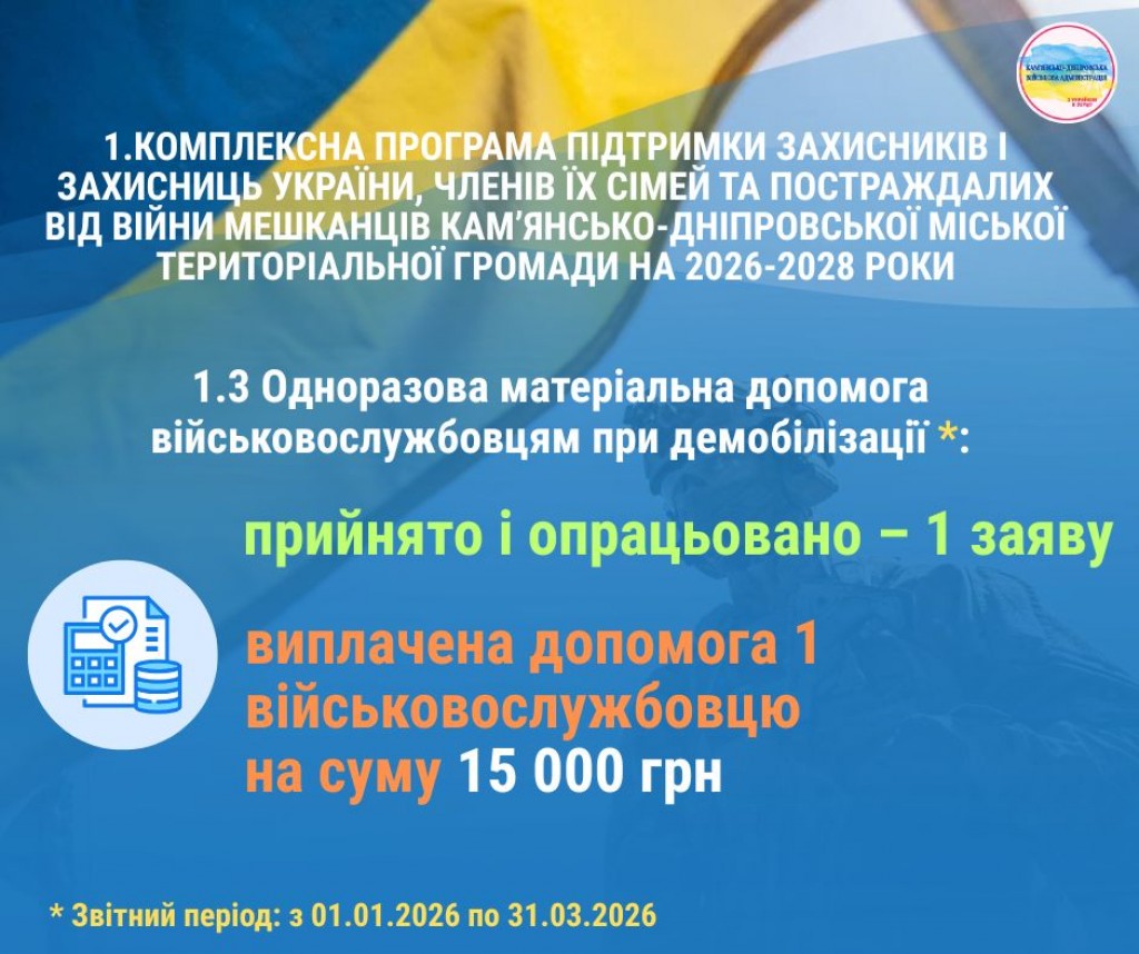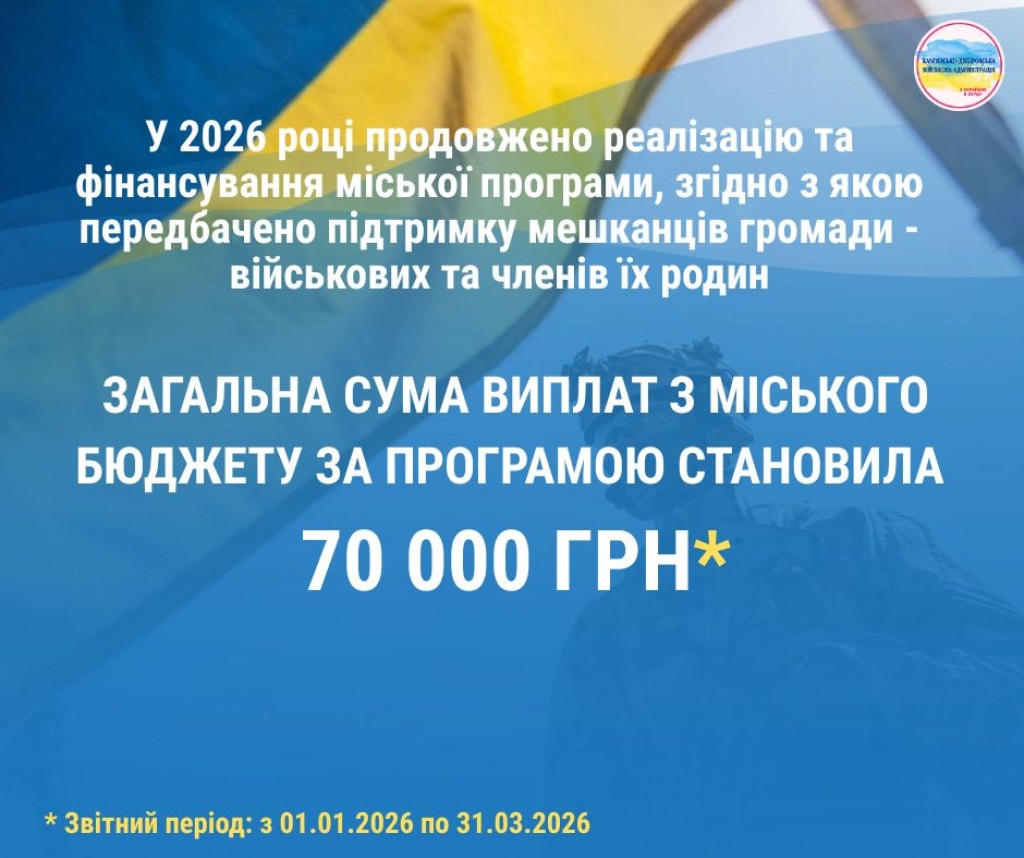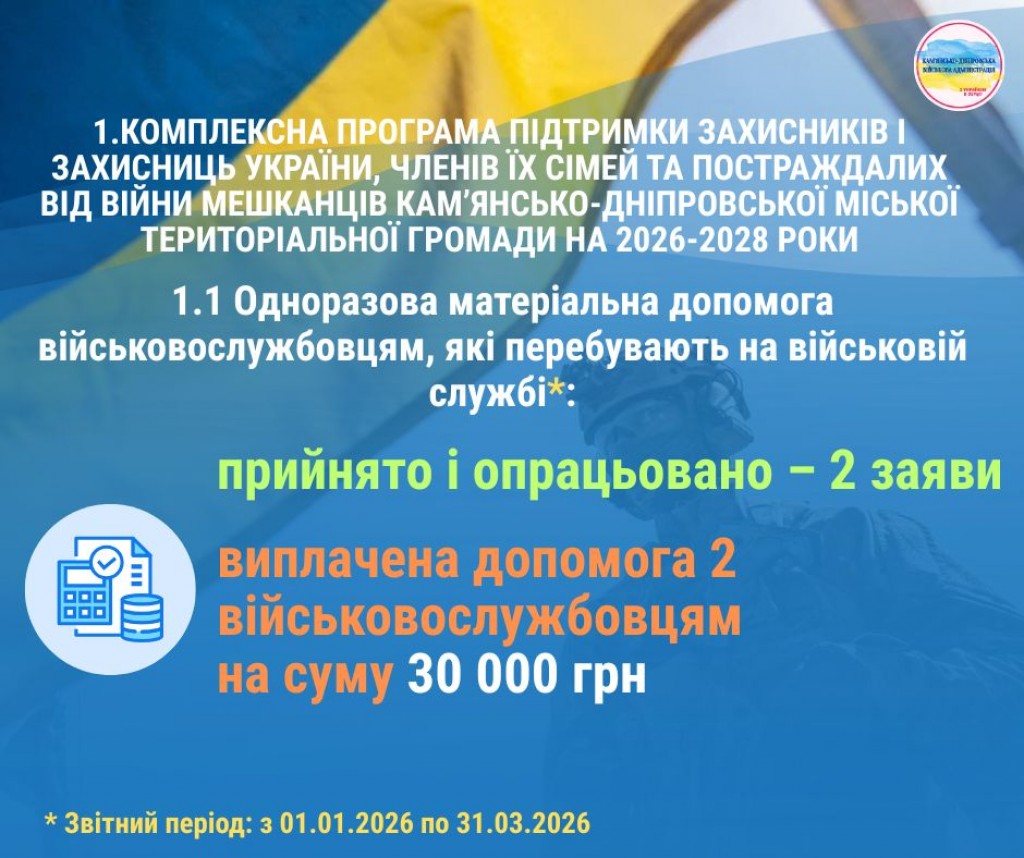 Друзі! Пропонуємо ознайомитися з інфографікою, яка відображає результати реалізації програми громади з підтримки військовослужбовців, ветеранів, членів родин загиблих - мешканців Кам’янсько-Дніпровської громади за 1 квартал 2026 року.