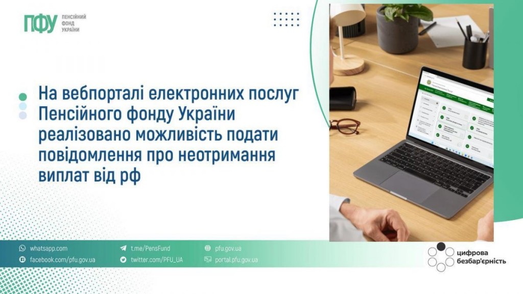 НА ВЕБПОРТАЛІ ЕЛЕКТРОННИХ ПОСЛУГ ПФУ РЕАЛІЗОВАНО МОЖЛИВІСТЬ ПОДАТИ ПОВІДОМЛЕННЯ ПРО НЕОТРИМАННЯ ВИПЛАТ ВІД рф