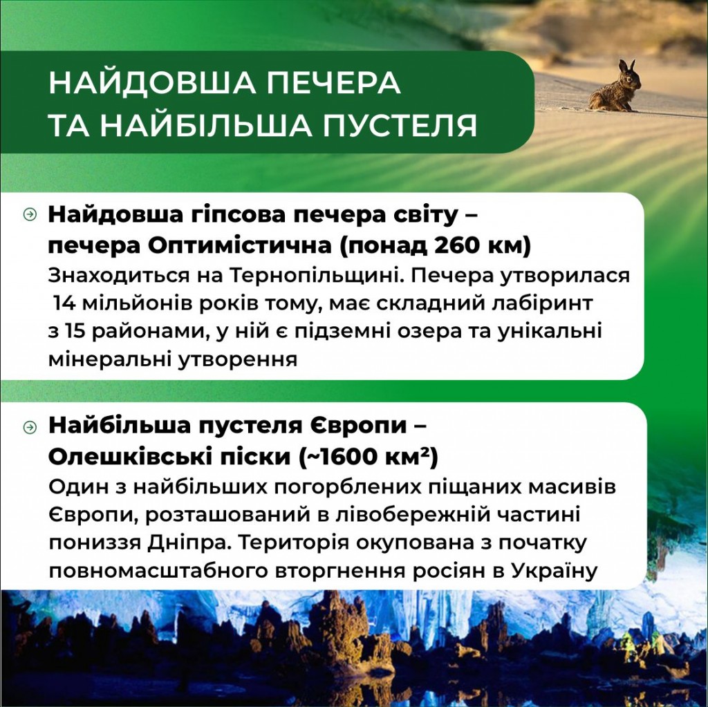 З інфографіки Ви дізнаєтеся про найвищу гору і найвище озеро, найдовшу гіпсову печеру світу, найбільшу пустелю Європи, степові перлини, рідкісні дерева Криму, а також про унікальних представників фауни.