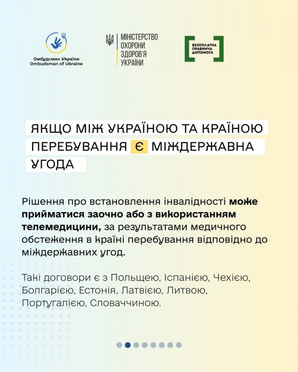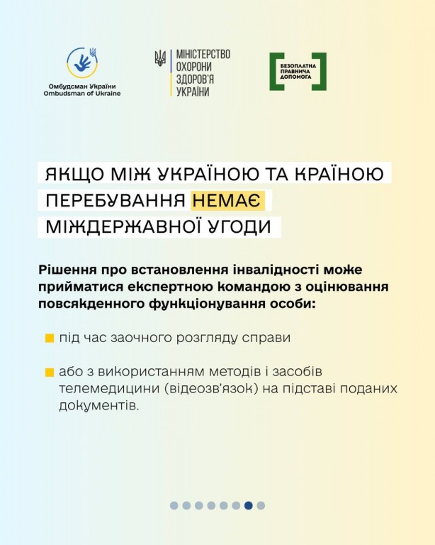 Якщо людина легально перебуває за кордоном і їй потрібно встановити чи продовжити інвалідність - це можна зробити дистанційно. Процедура відрізняється залежно від того, чи є міждержавний договір між Україною та країною перебування.