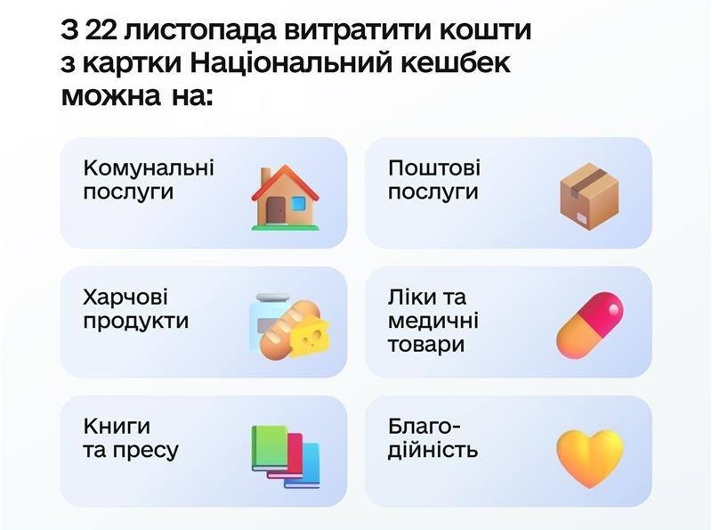 Кошти, накопичені на картці Національного кешбеку, можна використати на такі категорії товарів і послуг: