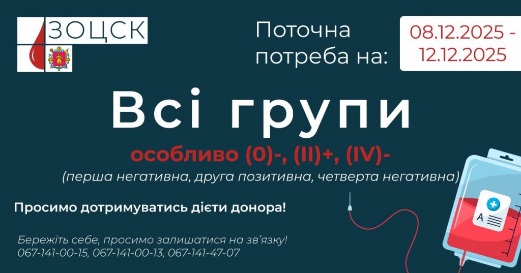Потреба - ВСІ групи крові ОСОБЛИВО: (0)-, (II)+ та (IV)- (перша негативна, друга позитивна та четверта негативна).