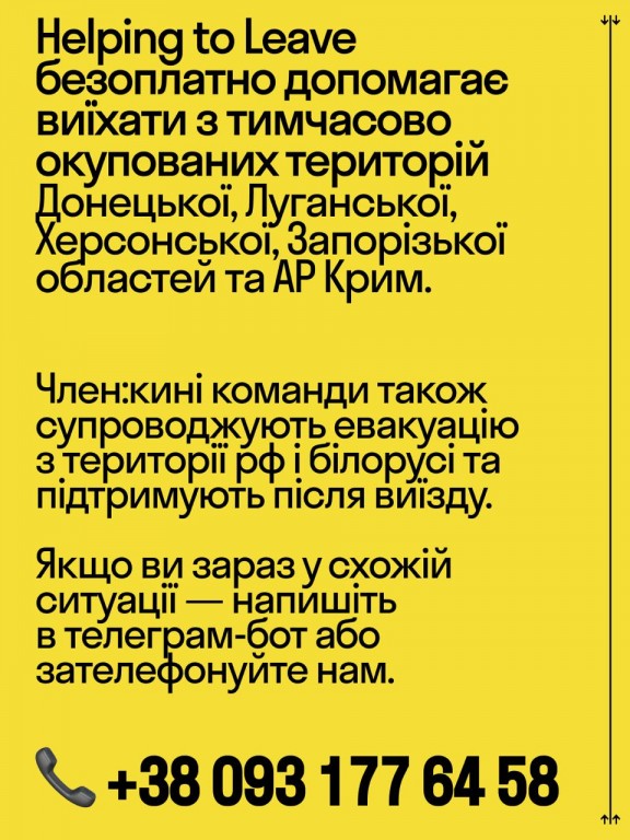 Helping to Leave безоплатно допомагає виїхати з тимчасово окупованих територій Донецької, Луганської, Херсонської, Запорізької областей та АР Крим.