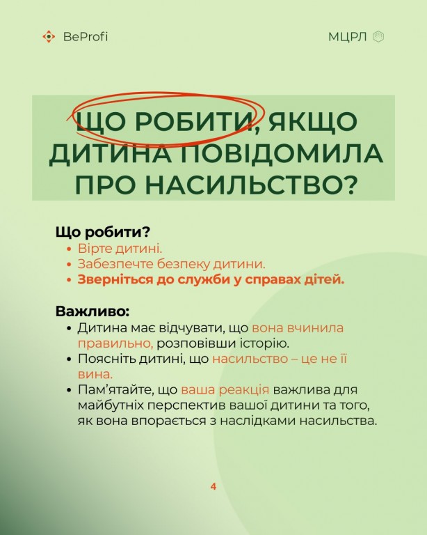 Якщо дитина розповіла про насильство, найперше - потрібно спокійно вислухати й сказати: «Я тобі вірю». «Ти не винна/не винен у тому, що сталося». «Дякую, що розповіла/розповів».