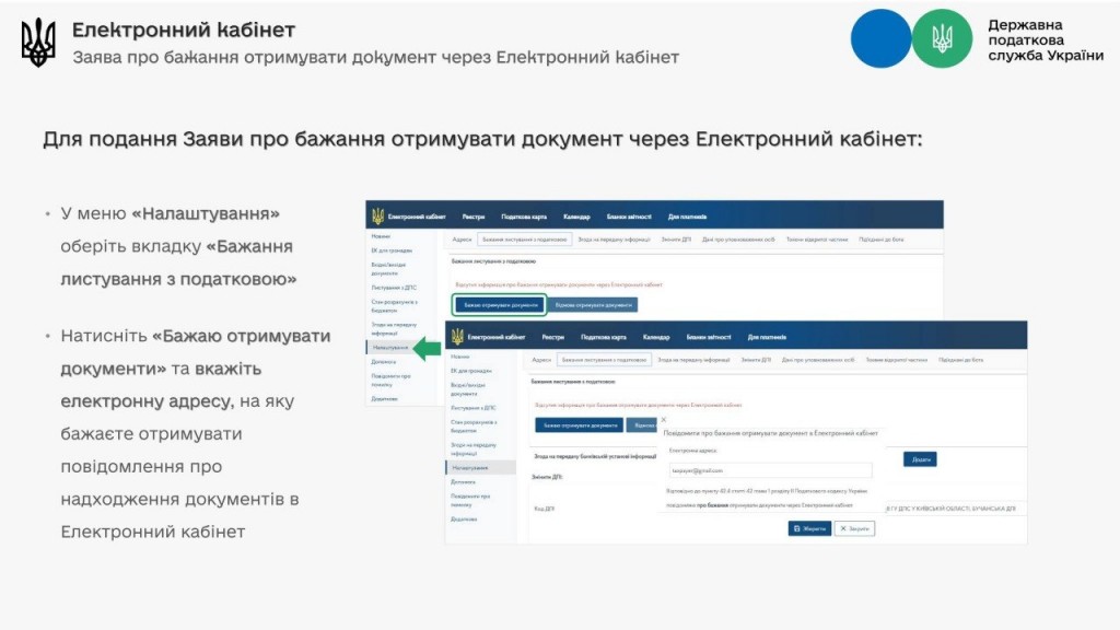 Що це означає? Ви самостійно обираєте формат листування. Для переходу достатньо подати заяву через Електронний кабінет. Після цього всі документи від ДПС надходитимуть онлайн, а також приходитимуть повідомлення на e-mail про: