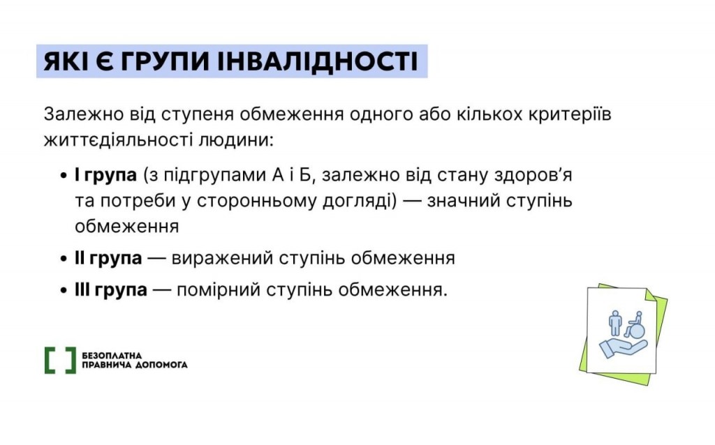 Які існують групи інвалідності та на який строк встановлюється інвалідність - фахівці Системи надання безоплатної правничої допомоги розповіли у картках.