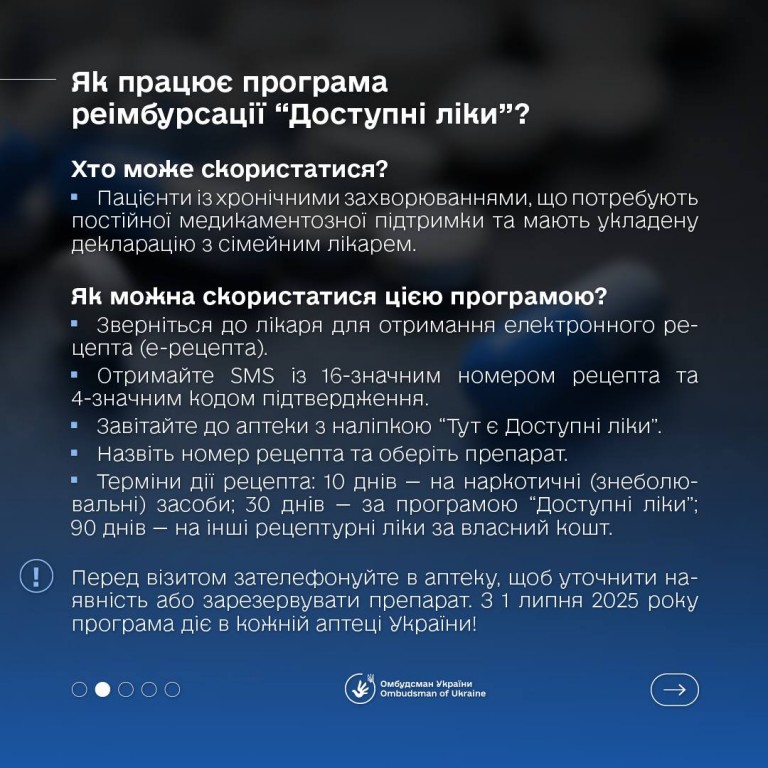 Як зазначає Омбудсман України, з 31 березня 2026 року розширено перелік програми реімбурсації - додано 37 нових препаратів. Тепер пацієнти можуть отримати безоплатно або з частковою доплатою 748 позицій лікарських засобів та медичних виробів.