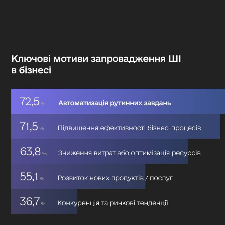 - Ключовий мотив упровадження ШІ — автоматизація завдань, підвищення ефективності бізнес-процесів та оптимізація витрат.