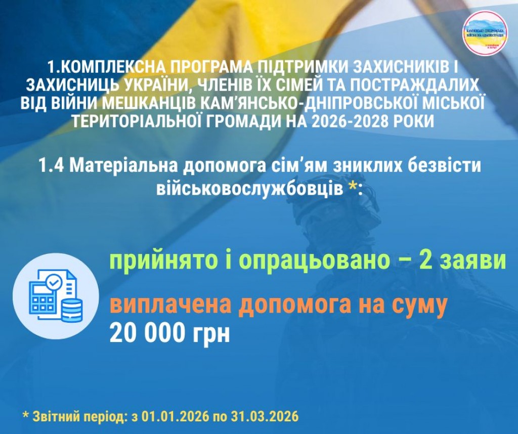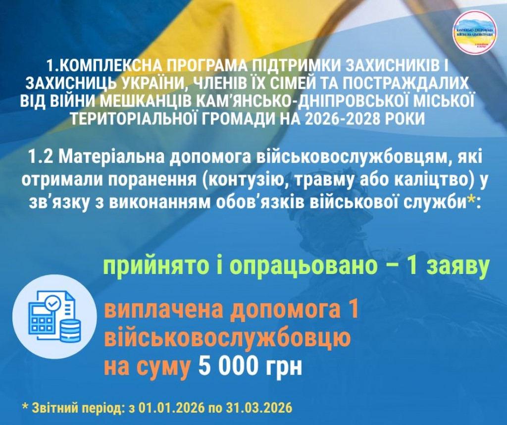 Друзі! Пропонуємо ознайомитися з інфографікою, яка відображає результати реалізації програми громади з підтримки військовослужбовців, ветеранів, членів родин загиблих - мешканців Кам’янсько-Дніпровської громади за 1 квартал 2026 року.
