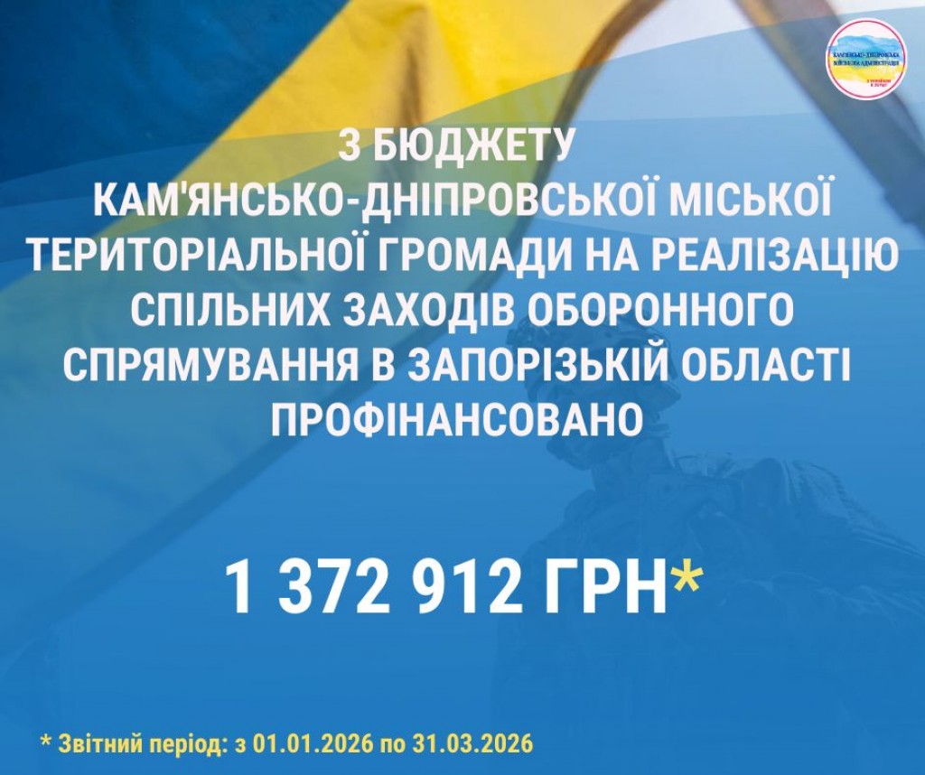 Також у 2026 році з бюджету нашої Кам'янсько-Дніпровської міської територіальної громади на реалізацію спільних заходів оборонного спрямування в Запорізькій області профінансовано 1 372 912 грн.