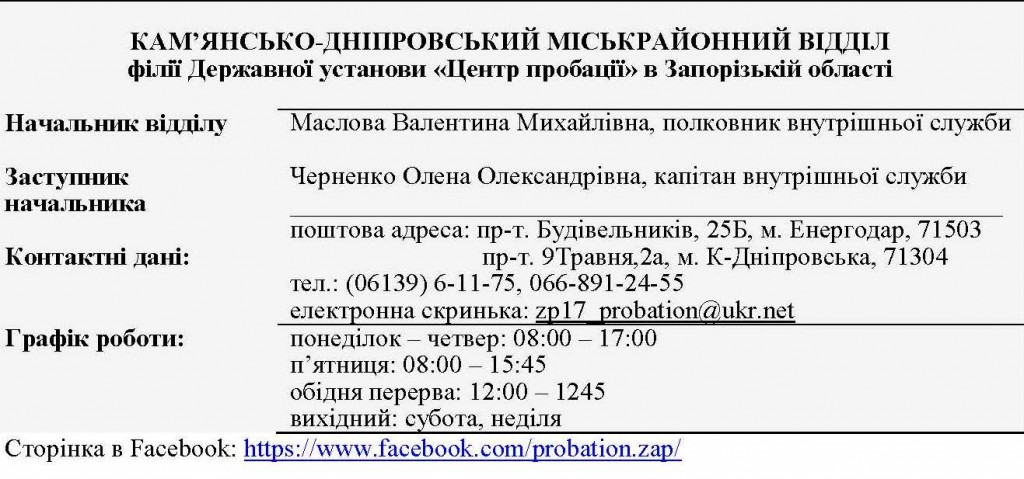| КАМ’ЯНСЬКО-ДНІПРОВСЬКИЙ МІСЬКРАЙОННИЙ ВІДДІЛ філії Державної установи «Центр пробації» в Запорізькій області |
