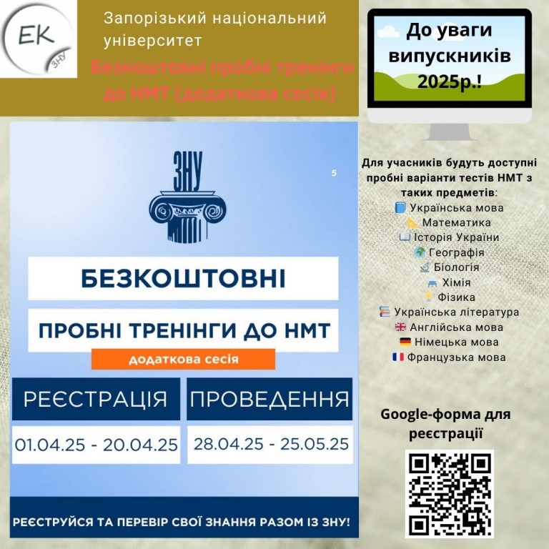 👉До уваги випускників 2025 року! Запорізький національний університет проводить безкоштовні пробні тренінги до НМТ (додаткова сесія). ✍️ Реєстрація на пробні тренінги триватиме 📅 до 20.04.2025р. ⚙️ Проведення пробних тренінгів заплановане з 28 квітня 2025 року і до 25 травня 2025 року. 🔵 Для учасників будуть доступні пробні варіанти тестів НМТ з…