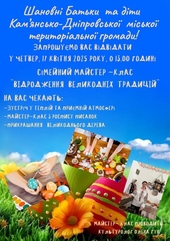 Запрошуємо Вас з дітками відвідати сімейний майстер-клас«Відродження Великодніх традицій»Дата проведення: 17.04.2025Час проведення: 13.00Місце проведення: вул. Дмитра Апухтіна (Матросова), 6, 4 поверх, кабінет 4.1. За всіма додатковими питаннями телефонуйте: 0665019925Приходьте, буде…