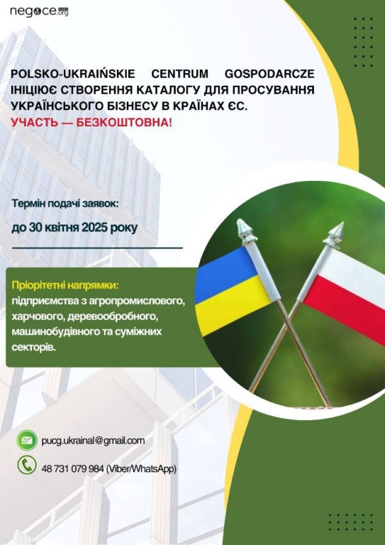 🇵🇱🇺🇦 Польсько-український господарчий центр ініціює створення спеціалізованого бізнес-каталогу «Україна в Європі», який безкоштовно розповсюджуватиметься серед європейських підприємців та інвесторів, торгово-промислових палат, галузевих бізнес-асоціацій, дипломатичних представництв у Польщі та країнах ЄС. 🔵 Мета проєкту- підтримка України в…