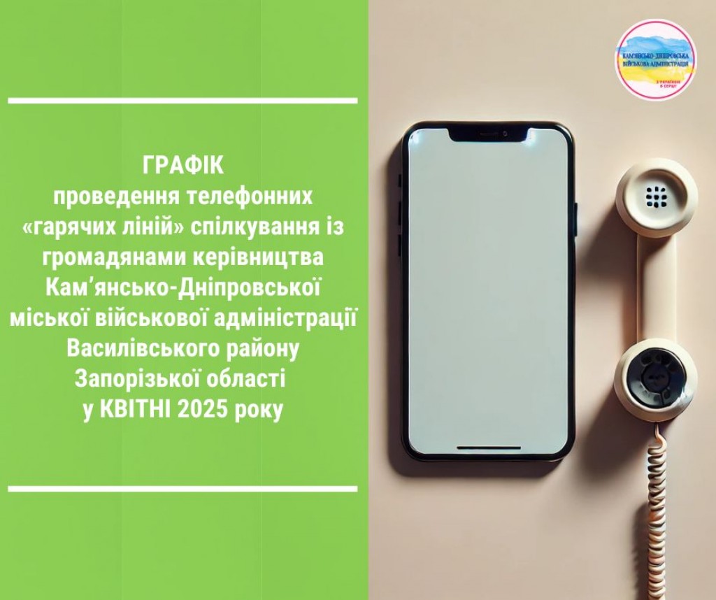 📝 Графік проведення телефонних «гарячих ліній» спілкування із громадянами керівництва Кам’янсько-Дніпровської міської військової адміністрації Василівського району Запорізької області у квітні 2025 року: ✅ 01, 08, 15, 22, 29 квітня з ⏰ 12.00 до 13.00 ☎️ Телефон «гарячої лінії»:…