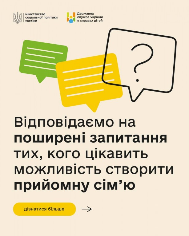 👫 Існує кілька способів стати родиною для дитини, яка залишилася без батьківської опіки. Зокрема і прийомна сім’я - сім’я, яка виховує до чотирьох дітей-сиріт і дітей, позбавлених батьківського піклування, до їхнього повноліття або до 23 років. 👉 Міністерство соціальної політики України разом з Державною службою України у справах дітей відповіли на поширені запитання…