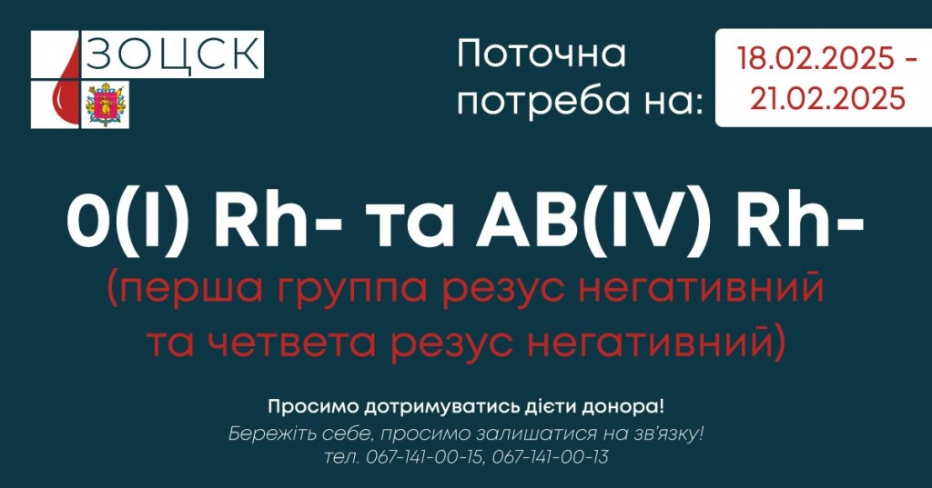🩸 Запорізький обласний центр служби крові запрошує донорів крові 0(I) Rh- та AB(IV) Rh- (перша резус негативний та четверта негативна) потреба 📆 з 18 по 21 лютого.🌡 Для усунення черг Центр просить попередньо погодити візит з працівниками реєстратури Служби крові за тел. 067-141-00-15, 067-141-00-13, 067-141-47-07.🥪Також, перед донаціями необхідно дотримуватись…