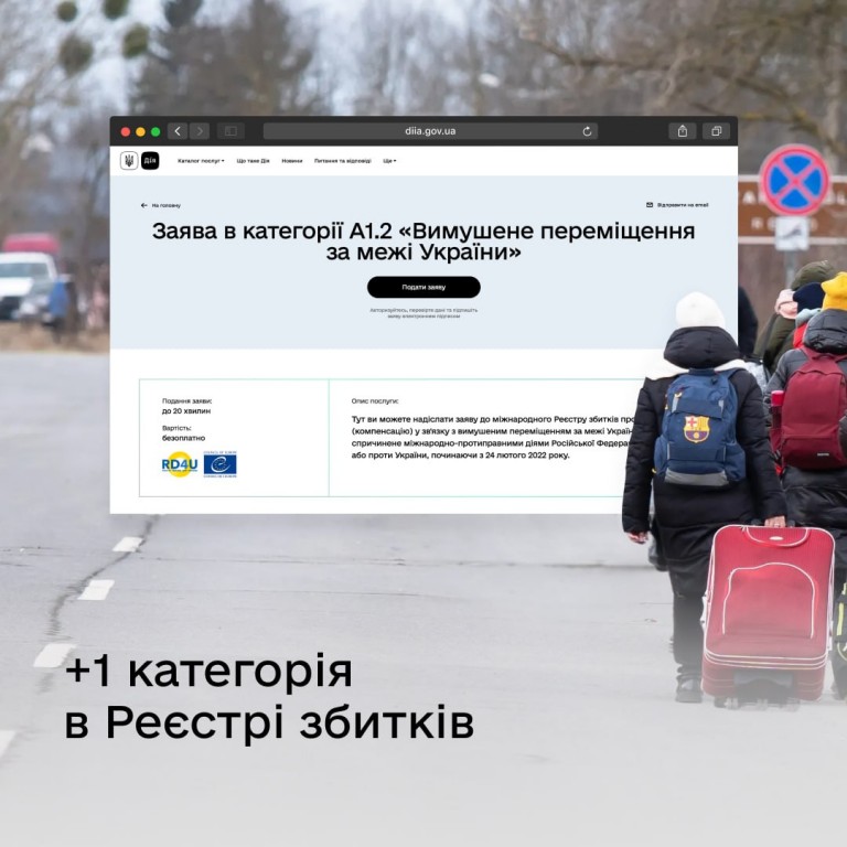 У Дії з’явилась нова категорія A1.2 «Вимушене переміщення за межі України». Якщо ви були змушені виїхати після 24 лютого 2022 року або не змогли повернутися додому через російську агресію, подавайте заяву про компенсацію за фактом вимушеного переміщення за кордон. Як подати заяву: Авторизуйтесь на порталі Дія Оберіть категорію A1.2 «Вимушене переміщення за межі…
