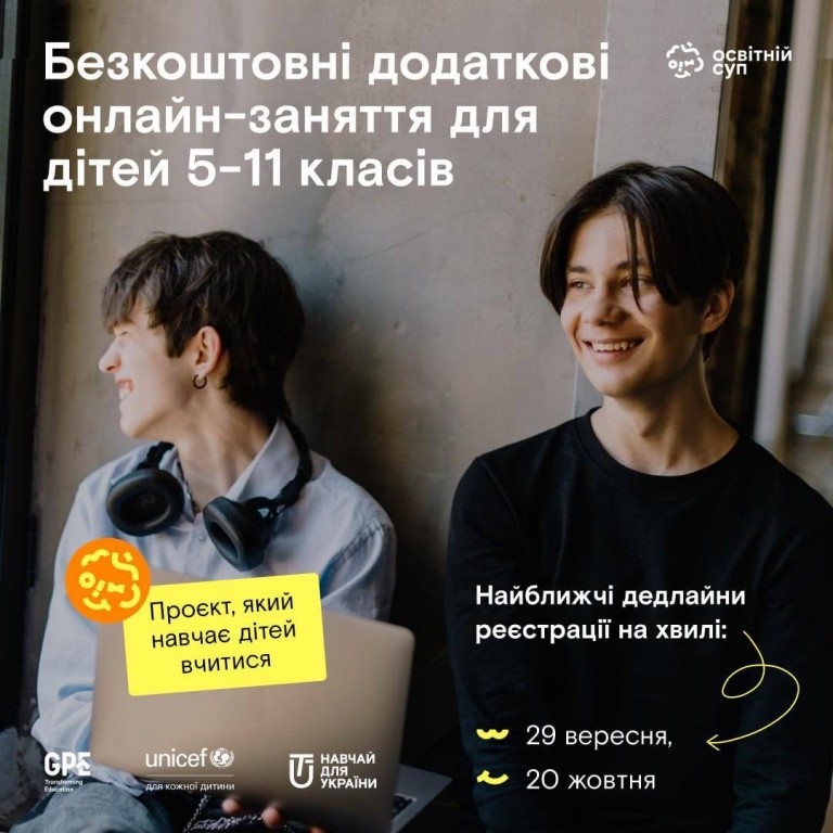 🔵 «Освітній Суп» - це безкоштовні додаткові онлайн-заняття для дітей 5-11 класів від ГО «Навчай для України». 👫 На проєкті на дитину чекають цікаві заняття з вчителями-тьюторами. Вона отримуватиме від уроків натхнення та віру у себе, складе власну траєкторію навчання та розвине мʼякі навички. 🌊 Навчання у проєкті відбувається хвилями: одна хвиля…