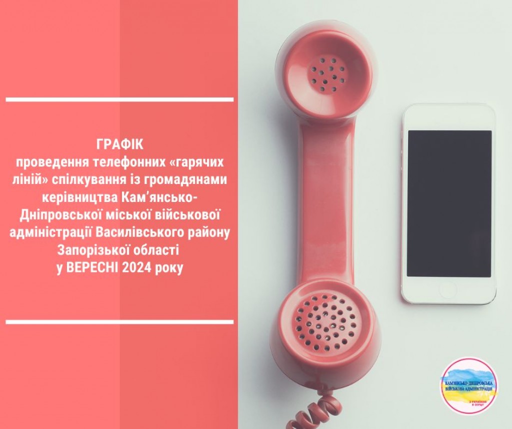 📝Графік проведення телефонних «гарячих ліній» спілкування із громадянами керівництва Кам’янсько-Дніпровської міської військової адміністрації Василівського району Запорізької області у вересні 2024 року: ✅ 03, 10, 17, 24 вересня з ⏰12.00 до 13.00 ☎️Телефон «гарячої лінії»:…