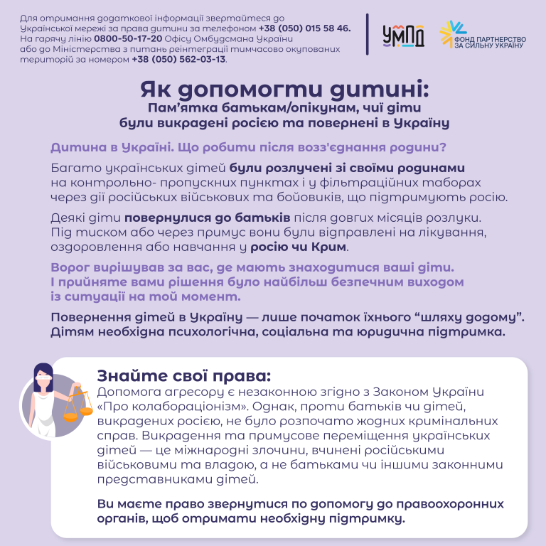 ПАМ’ЯТКА ДЛЯ БАТЬКІВ/ОПІКУНІВ, ЧИЇ ДІТИ БУЛИ ВИКРАДЕНІ РОСІЄЮ ТА ПОВЕРНЕНІ В УКРАЇНУ