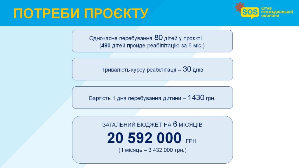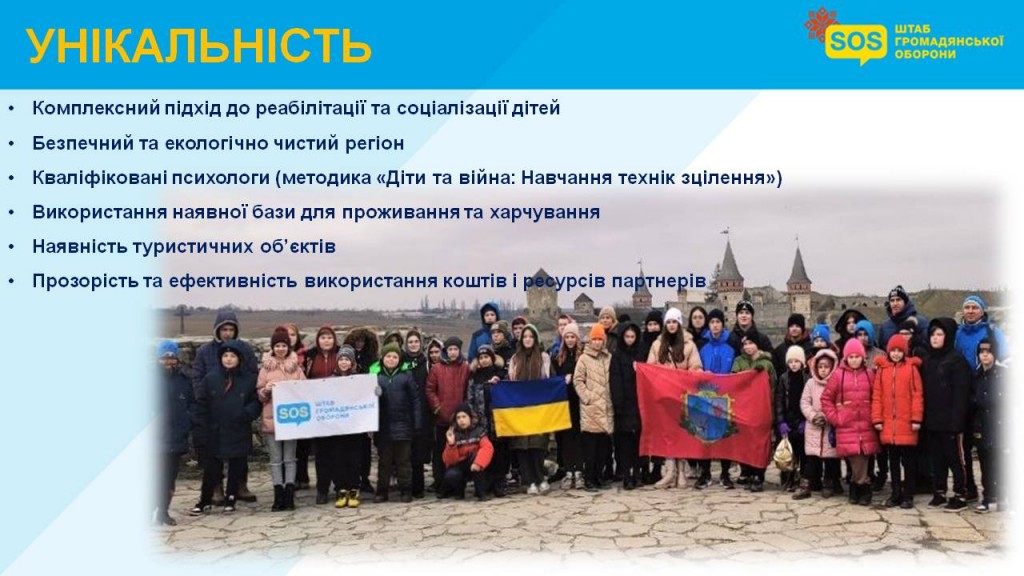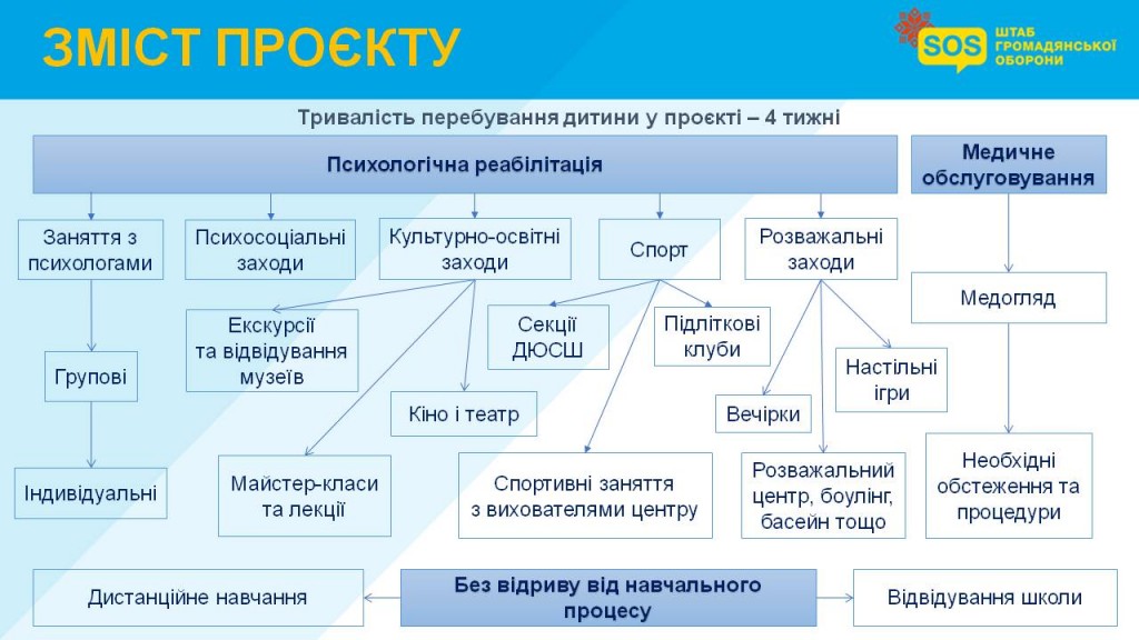 Участь у Програмі дасть дітям можливість «перевести подих», відпочити, оздоровитися, отримати психологічну та педагогічну допомогу. Вони зможуть зробити це разом зі своїми друзями та однолітками під наглядом професійних вихователів.