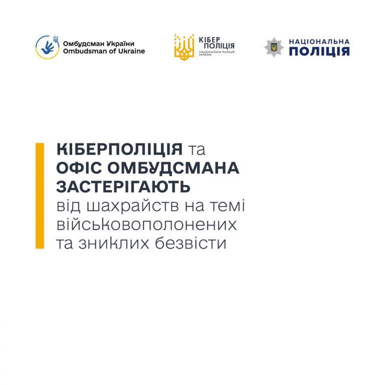 🔺 Кіберполіція та Офіс Омбудсмана застерігають від шахрайств на темі військовополонених та зниклих безвісти. 👆 Кіберполіція та Офіс Омбудсмана звертають увагу громадян на шахрайства, пов’язані з темою звільнення українських воїнів та пошуку безвісти зниклих людей. Зловмисники користуються вразливим емоційним станом їхніх родичів та близьких, вводячи в оману та виманюючи…