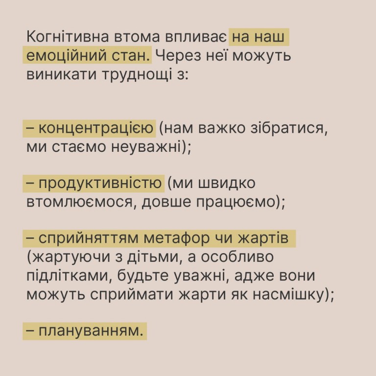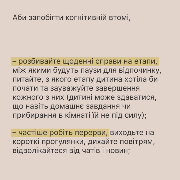 В умовах тривалого стресу і дорослим, і дітям властиве когнітивне виснаження — стан «психічної втоми», коли розумової роботи і відповідальності забагато, а відпочинку, сну та можливості розслабитися бракує.