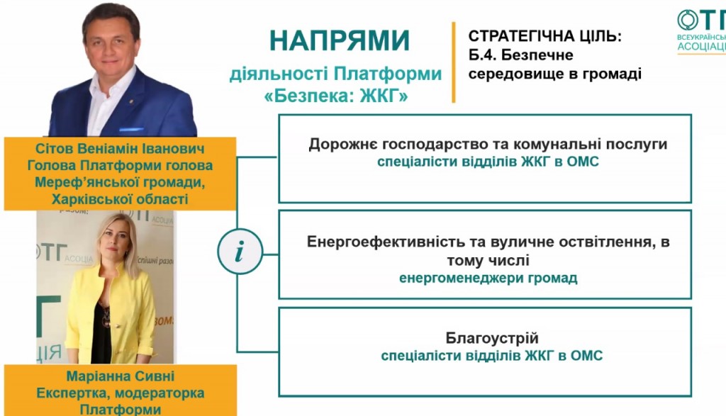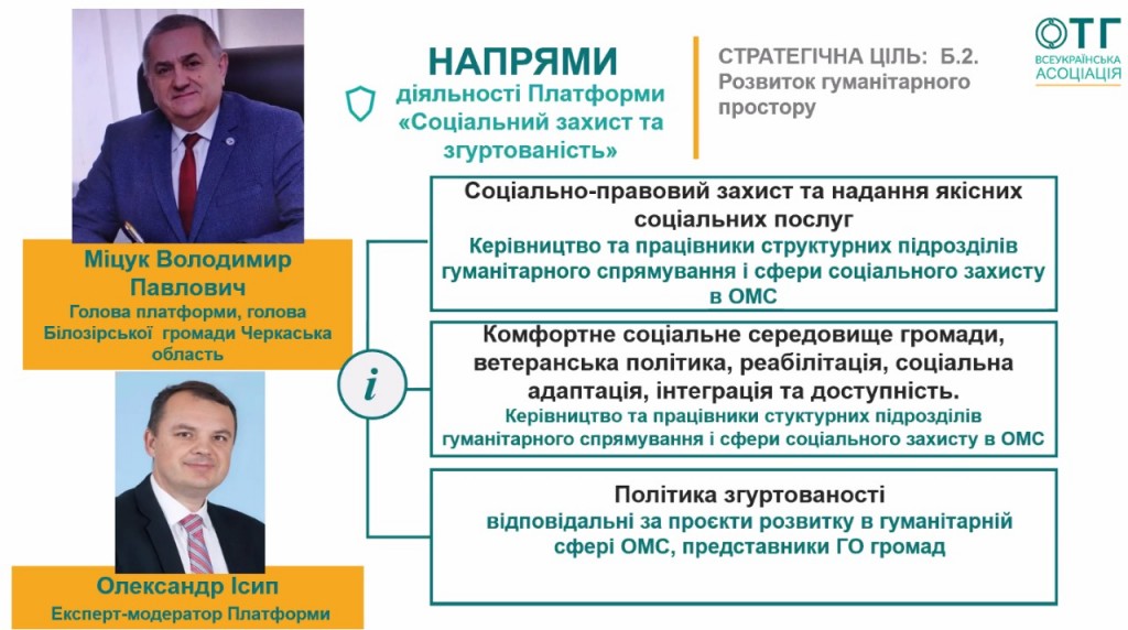Тематичні та секторальні платформи Всеукраїнської Асоціації ОТГ є постійно діючими консультативно-дорадчими органами Асоціації. Вони створені з метою побудови нової ефективної моделі співпраці членів Асоціації, надання інформаційних, консультаційних та навчальних послуг членам Асоціації, розробки рекомендацій та пропозицій до органів влади на національному рівні щодо реалізації державної політики, представлення та відстоювання інтересів членів ВАОТГ перед центральними та місцевими органами виконавчої влади, напрацювання спільної позиції щодо законодавчих ініціатив, обміну кращими практиками.