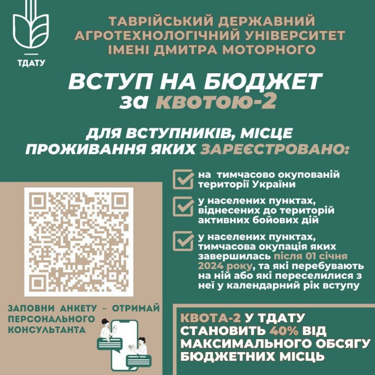 Шановний вступнику! Якщо ти випускник 11 класу закладу загальної середньої освіти, випускник закладу професійної освіти або фахової передвищої освіти і твоє місце проживання зареєстровано: 👉Ти можеш скористатися:✅ спеціальними умовами вступу за державним замовленням✅ і бути зарахованим до ТДАТУ на освітній рівень бакалавра на бюджетні місця у межах квоти-2. 👉ЩО ТАКЕ…