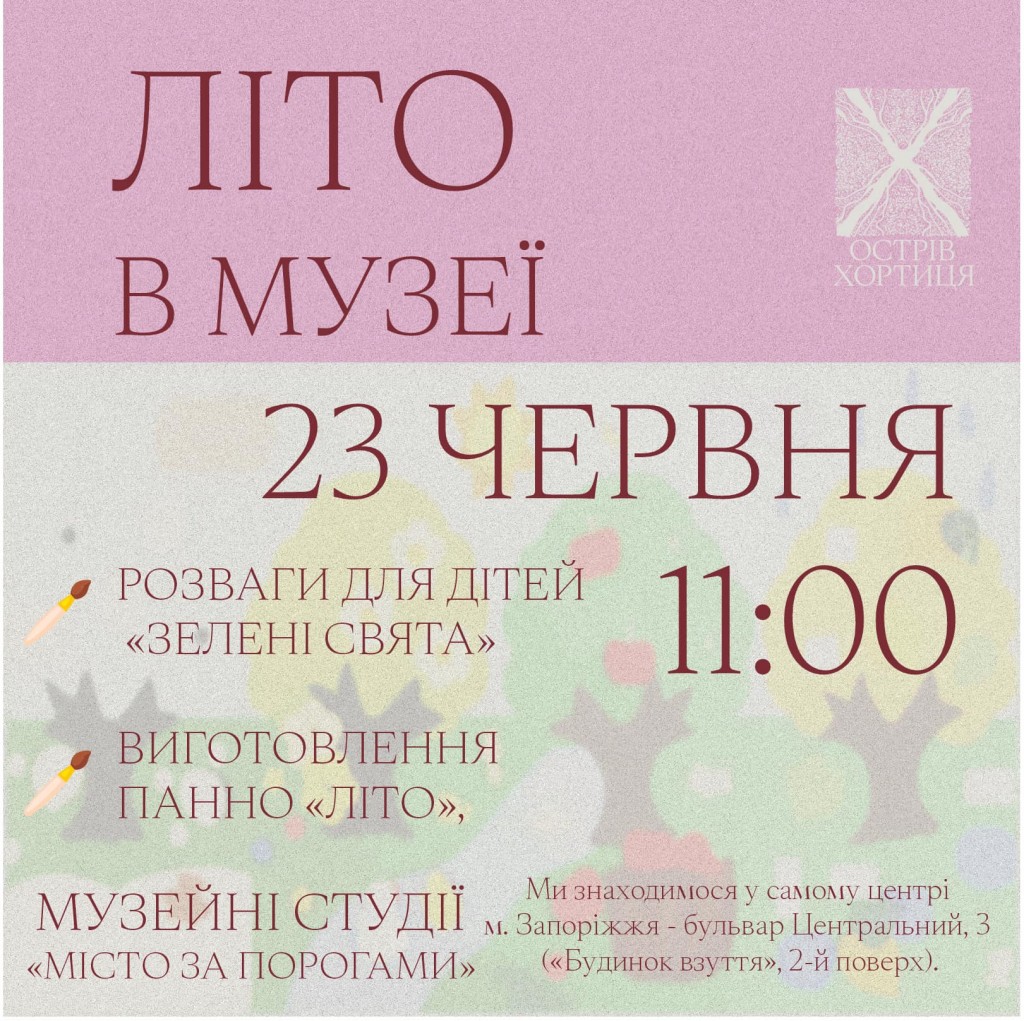 🙌 Приходьте на майстер-клас до Музейних студій «Місто за порогами», де всі охочі візьмуть участь у виготовленні панно «ЛІТО».🌿 «Зелені свята» наближаються, а це завжди був час особливої і майже сакральної творчості для кожної української родини і громади. Буде дуже цікаво!📅 Майстер-клас пройде 23 червня 2024 року (неділя) об…