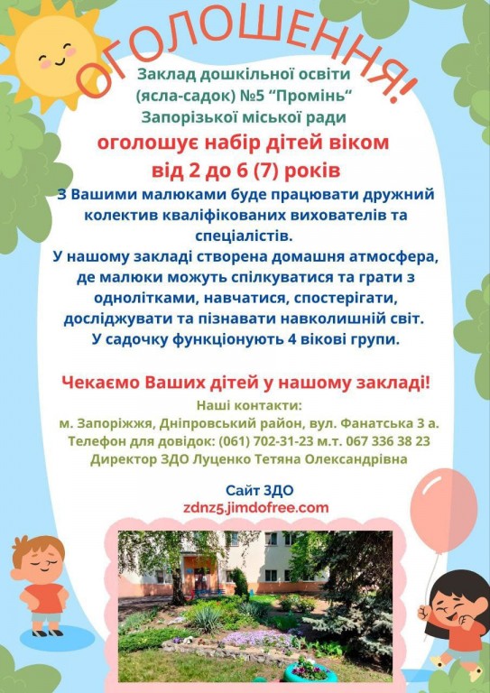 Дружній нам дитячий садок набирає дітейЦентр допомоги Кам'янсько-Дніпровської…