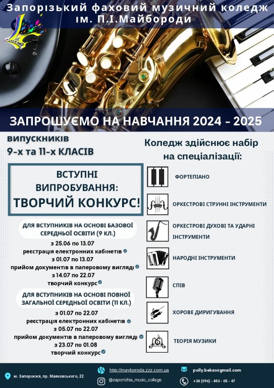 🙌 Запорізький фаховий музичний коледж ім. П.І.Майбороди запрошує на навчання учнів 9 та 11 класів, основне місце реєстрації яких є тимчасово окуповані території Запорізької, Херсонської, Донецької, Луганської областей та АР Крим. Цьогоріч коледж здійснює набір для абітурієнтів з тимчасово окупованих територій на пільгових умовах.🎼 Коледж проводить набір на такі…