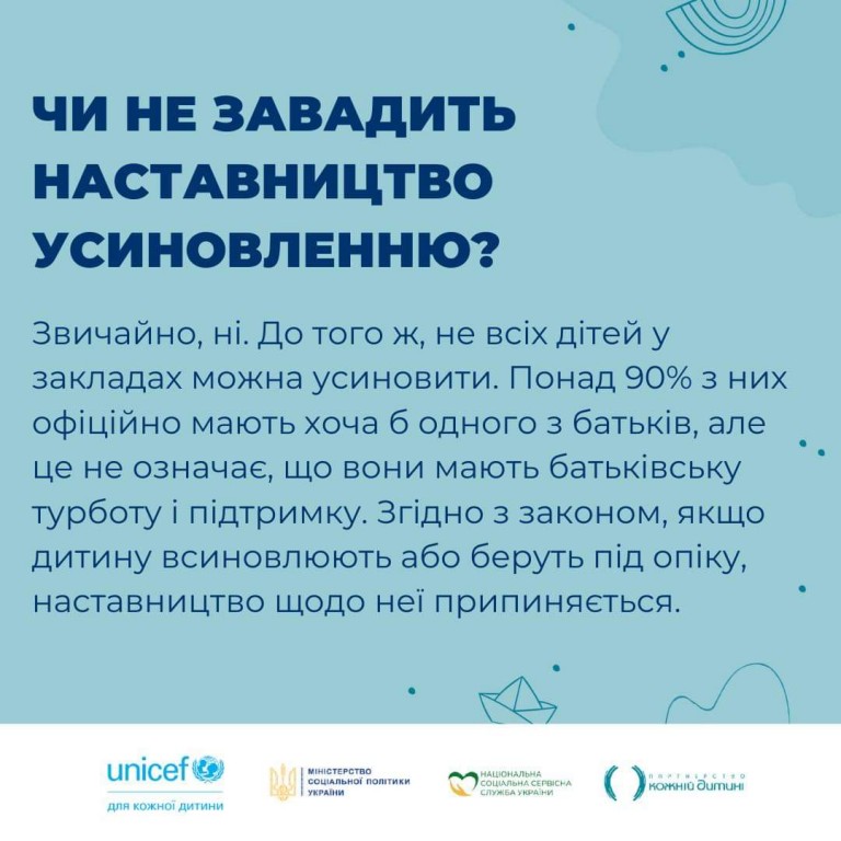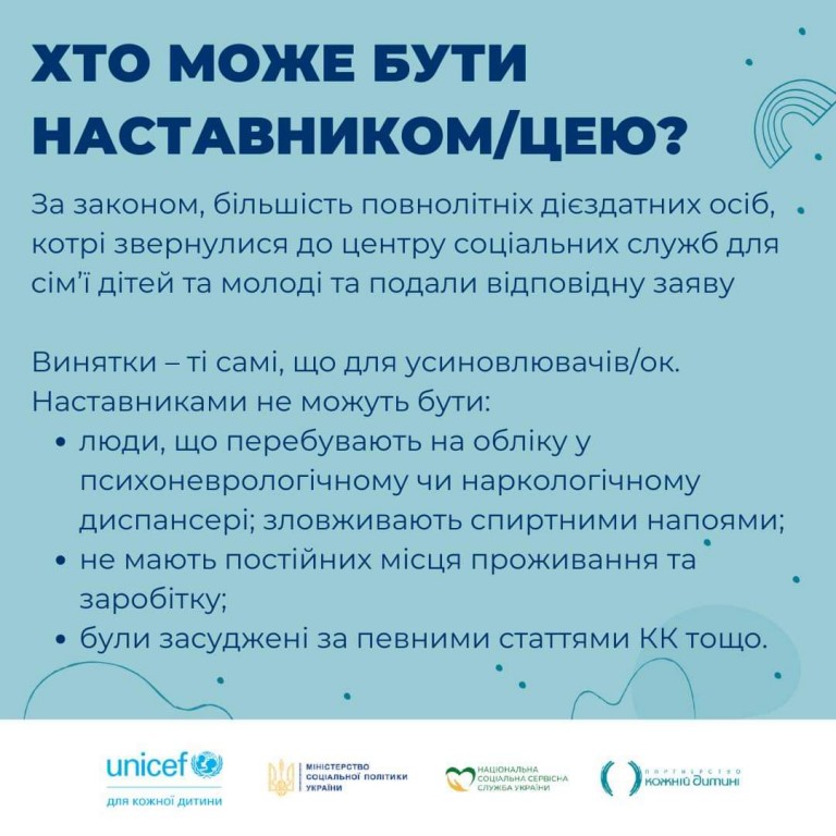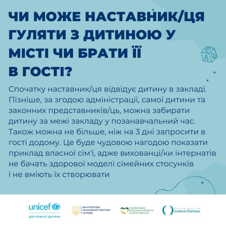 ✅ «Важливо, щоб наставник не перейняв на себе батьківські ролі», – підкреслює заступниця директора з реалізації програм Партнерства «Кожній дитині» Зінаїда Кияниця. «Наставництво регулюється низкою нормативно-правових актів, котрі визначають, хто і за яких умов може бути наставником. Для цього необхідно пройти спеціальний курс підготовки, укласти договір із закладом, де дитина виховується та центром соціальних служб. І головне – отримати згоду самої дитини.