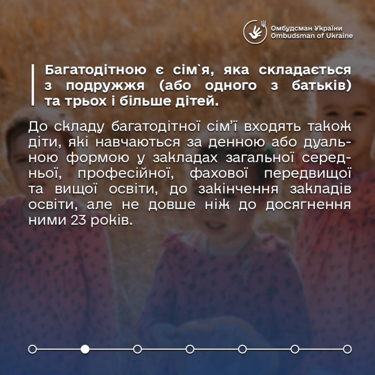 👨👩👧👦 Сім’я може отримати статус багатодітної, якщо вона виховує трьох або більше дітей. Такі родини мають право на знижку на паливо, житлово-комунальні послуги та інші пільги.