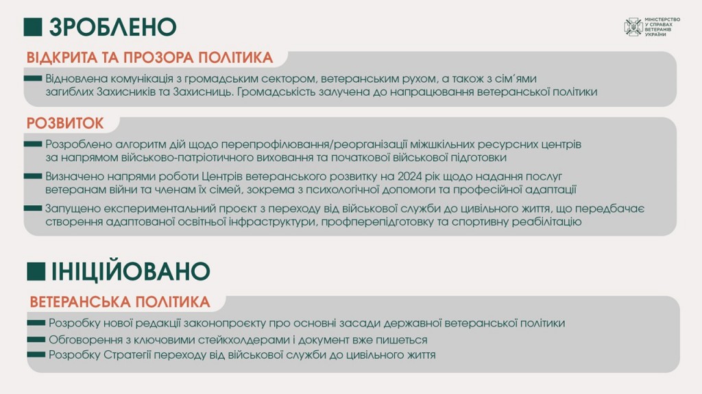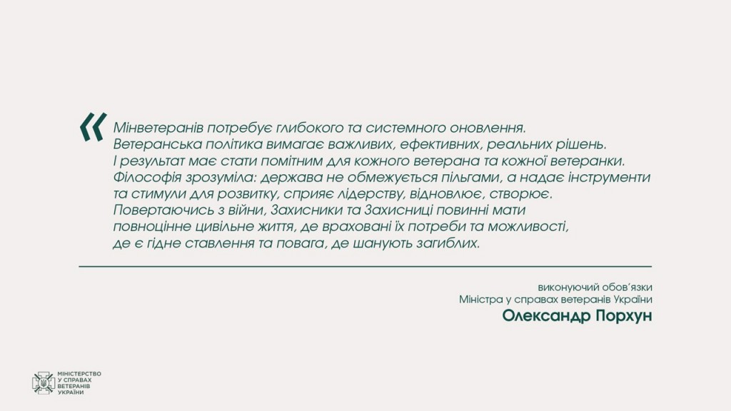 Як зазаначає в.о. міністра у справах ветеранів Олександр Порхун, цей місяць показав, що політика може динамічно та якісно змінюватися: відновлені комунікації, переглядаються та оновлюються підходи у формуванні стратегічних документів, визначені ключові напрями роботи та реалізовані проєкти, що мають спростити шлях повернення від військового до цивільного життя.