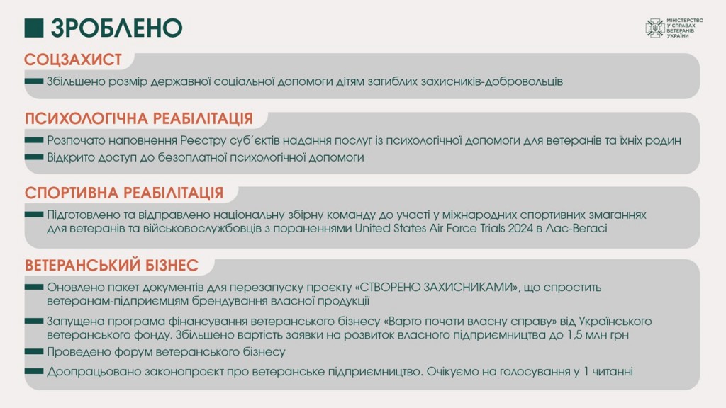 - запущена програма фінансування ветеранського бізнесу «Варто почати власну справу» від Українського ветеранського фонду. Збільшено вартість заявки на розвиток власного підприємництва до 1,5 млн грн