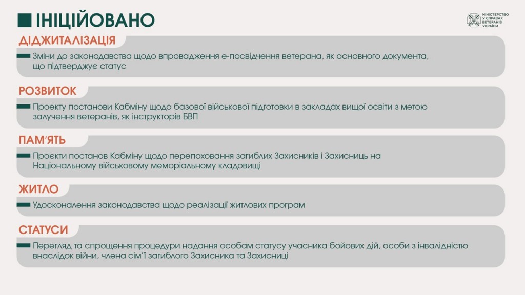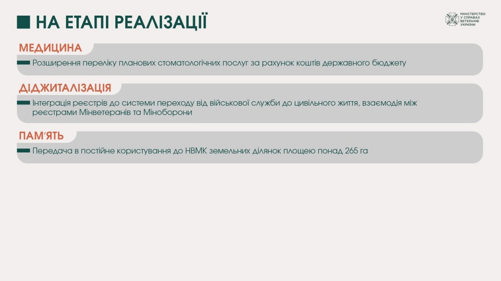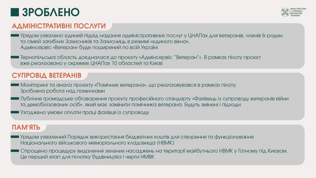 - розпочато наповнення Реєстру суб’єктів надання послуг із психологічної допомоги для ветеранів та їхніх родин та відкрито доступ до безоплатної психологічної допомоги за принципом трирівневої системи організації та надання таких послуг. Це соціально-психологічна підтримка та супровід, психологічна допомога, комплексна медико-психологічна допомога. Послуги можуть надаватися стаціонарно, амбулаторно або дистанційно.