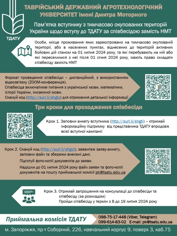 📝 Пам’ятка вступнику з тимчасово окупованих територій України щодо вступу до Таврійського державного агротехнологічного університету імені Дмитра Моторного за співбесідою замість НМТ💻 Сайт…