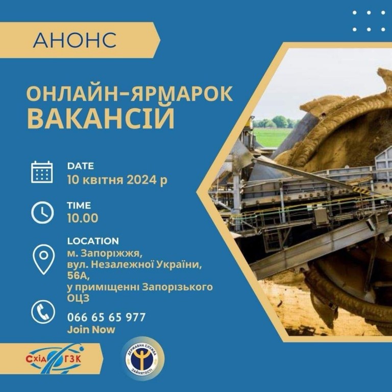 📅10 квітня 2024 ⏰о 10.00 у приміщенні Запорізького обласного центру зайнятості за адресою: 🏢 м. Запоріжжя, вул. Незалежної України 56 А відбудеться онлайн-ярмарок вакансій для укомплектування актуальних вакансій на державному підприємстві «Східний гірничо-збагачувальний комбінат» (ДП «СхідГЗК»).🟡 ДП «СхідГЗК» є єдиним в Україні…