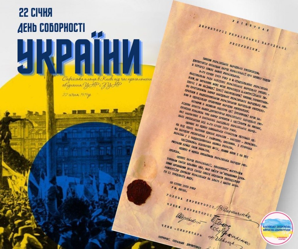 22 січня - День Соборності України. Це день, який нагадує, що Україна була, є і буде єдиною. Цього дня в 1919 році на Софійському майдані в Києві було проголошено Акт Злуки - об’єднання Української Народної Республіки та Західноукраїнської Народної Республіки. Подія, що стала символом віковічного прагнення українців жити в одній, соборній державі. «Однині воєдино зливаються століттями…