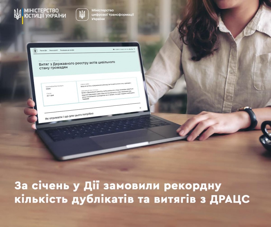 У СІЧНІ УКРАЇНЦІ ЗАМОВИЛИ РЕКОРДНУ КІЛЬКІСТЬ ДУБЛІКАТІВ СВІДОЦТВ І ВИТЯГІВ З ДРАЦС ЧЕРЕЗ ПОРТАЛ ДІЯ