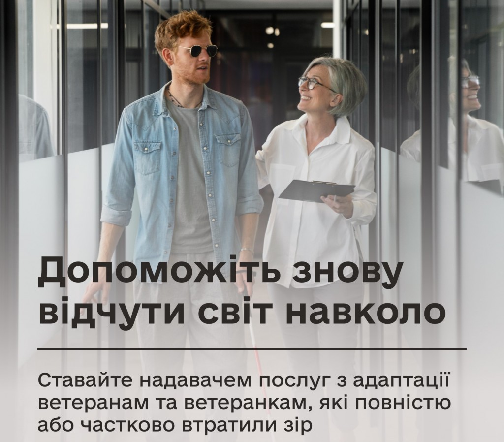 Мінветеранів запрошує до співпраці юридичних осіб та фізичних осіб-підприємців — для участі в експериментальному проєкті з надання послуг з адаптації ветеранам і ветеранкам, які повністю або частково втратили зір. Це проєкт, у якому ваші знання, досвід і фаховість можуть стати підтримкою для тих, хто пройшов війну і потребує адаптації до нової реальності. Послуги повністю відшкодовуються з…