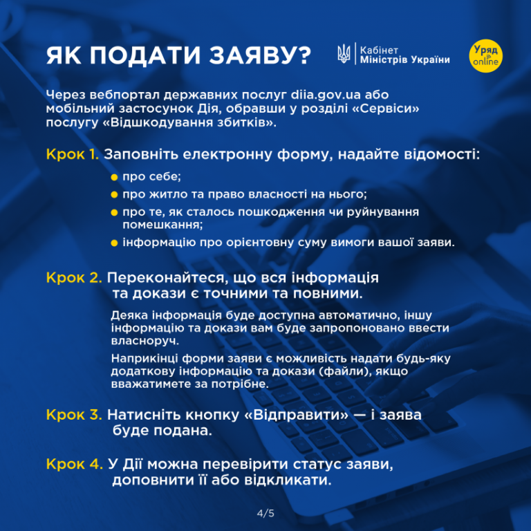 Українці можуть подати заяву до міжнародного Реєстру збитків, спричинених російською агресією проти України. Про руйнування свого житла, що сталося через повномасштабну війну, можна повідомити через Дію.