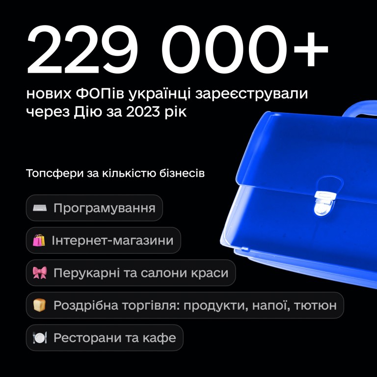 Україна — країна, де достатньо мати бажання й Дію, щоб стати підприємцем у кілька кліків. У 2022 році зареєстровано 141+ тис. ФОПів, а у 2023 кількість бізнесів зросла майже вдвічі! На другий рік повномасштабного вторгнення, під час постійних обстрілів, блекаутів відкрилося ще 229+ тис. нових ФОПів. Радіємо, що бюрократія не стала черговим викликом і Дія зробила ваше життя легшим! Адже ви не…