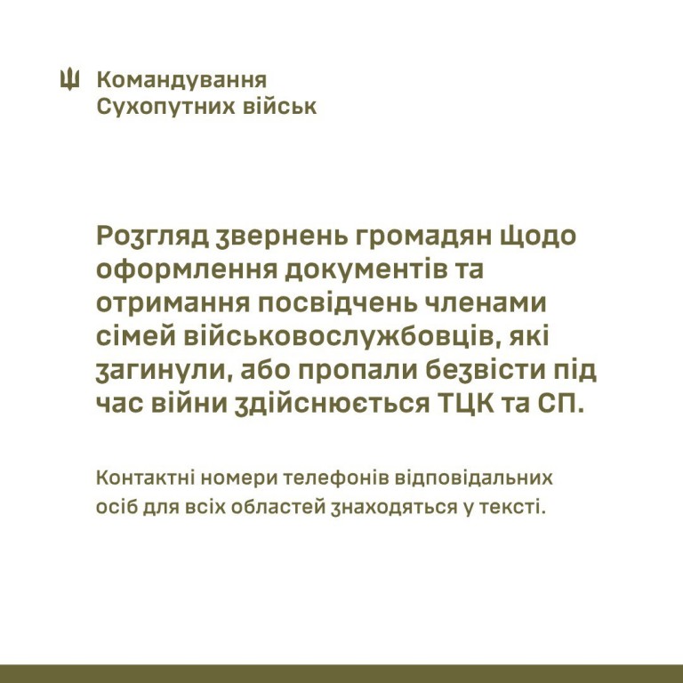 ☎️Гарячі лінії ОТЦК та СП ОК Південь Одеський ОТЦК та СП - 4875 2 82 60Вінницький ОТЦК та СП - 0432 66 05 67, 095 586 31 94Кіровоградський ОТЦК та СП - 050 036 47 98Херсонський ОТЦК та СП - 067 725 70 30Миколаївський ОТЦК та СП - 066 816 16 35 ☎️Гарячі лінії ОТЦК та СП за ОК «Схід» Дніпропетровський ОТЦК та СП - 056 770 82 93, 056 770 80 94Донецький ОТЦК та СП…