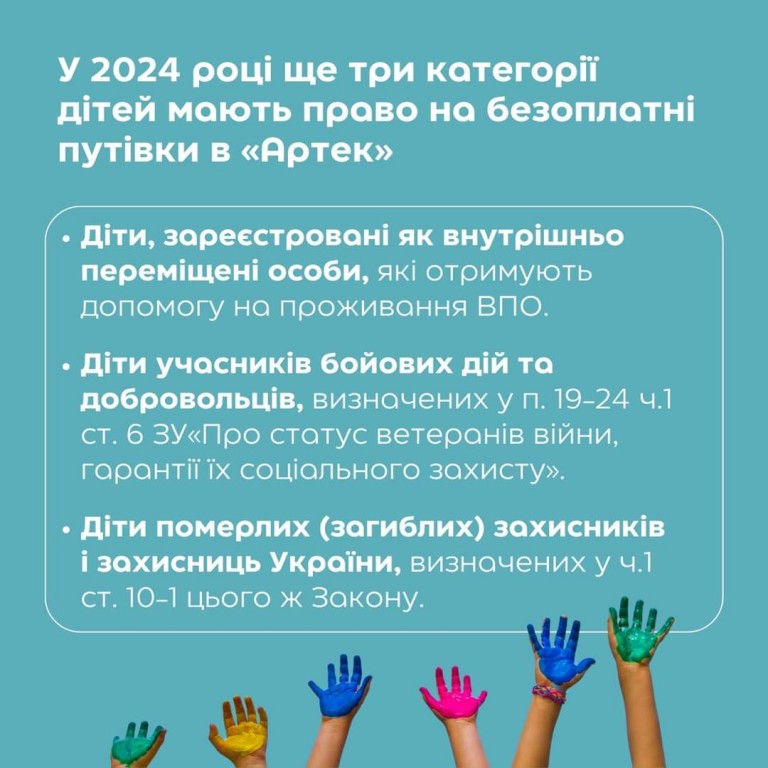 ✅ Цьогоріч ще більше школярів можуть отримати безоплатні путівки до дитячого центру «Артек» у Києві та на Закарпатті. Щоб подати заяву, необхідно звернутися до органів соціального захисту обласних військових адміністрацій.