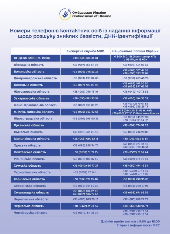 Оновлені номери телефонів контактних осіб із надання інформації щодо: 📌розшуку зниклих безвісти осіб;📌ДНК-ідентифікації в областях та у м. Києві. Омбудсман Лубінець…