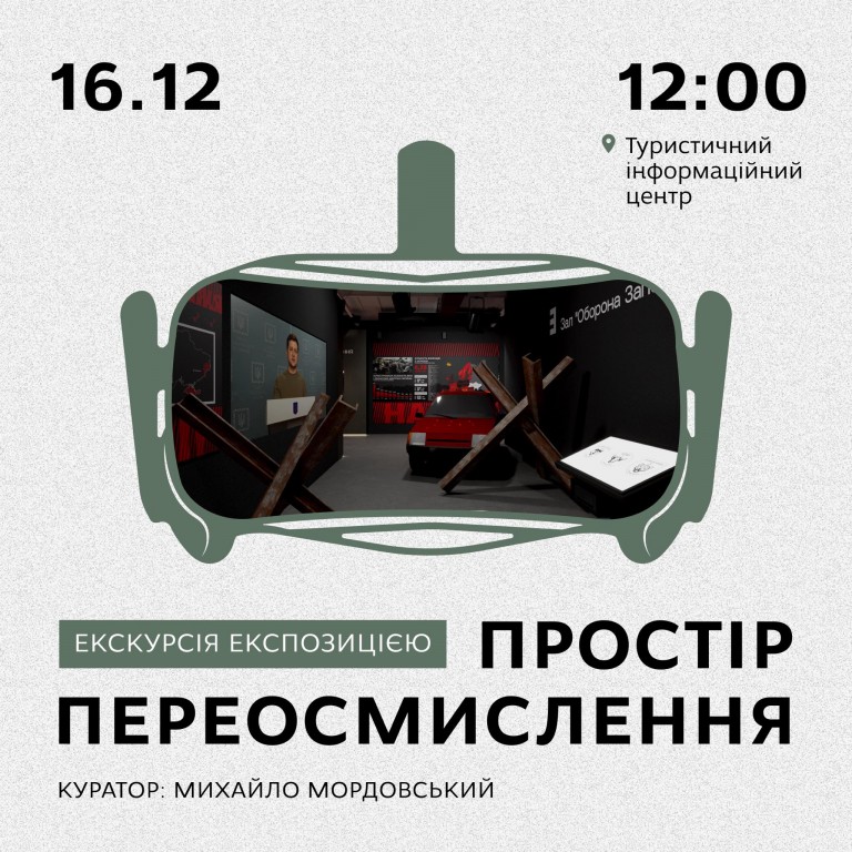 Туристичний інформаційний центр запрошує на кураторську екскурсію виставкою Простору Переосмислення! Зустріч проведе Михайло Мордовской - керівник крафтових музеїв Запоріжжя, гід і автор експозиції. 16 грудня, 12:00Участь безоплатна, попередня реєстрація: 050-424-20-54 Культурний центр Простір Переосмислення - майбутній культурний центр, що буде створений у Запоріжжі за фінансування групи…